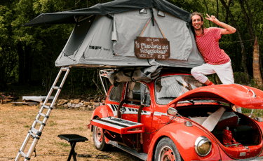 Con il suo Maggiolone Volkswagen del ’73 — chiamato affettuosamente Lino — viaggia tra boschi, altipiani e valli, trasformando ogni spazio naturale in un luogo di ascolto e di respiro.
